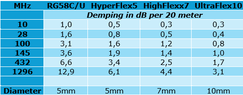 Over antennes wordt veel onzin verspreid. Over coaxkabels niet anders. Laten we eens uitgaan van een paar standaarden. U gebruikt antennes voor zowel de kortegolf als VHF/UHF. De door u gebruikte lengte van de voedingskabel zal meestal rond de 20 meter of korter zijn. Dan kunt u in de volgende tabel de verzwakking in dB’s over die afstand (20 meter) aflezen, per frequentie en per soort kabel.